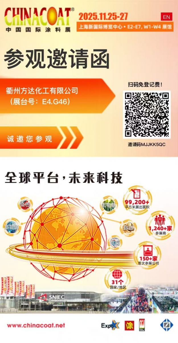 當(dāng)“碳達(dá)峰、碳中和”成為全球涂料行業(yè)的共同命題,一場(chǎng)關(guān)于綠色原料的“革命”正在悄然發(fā)生——衢州方達(dá)化工有限公司率先交出高分答卷!2025年11月25-27日,上海新國(guó)際博覽中心(SNIEC),方達(dá)化工將攜“專(zhuān)注新材料領(lǐng)域,用綠色原料編織低碳未來(lái)”的硬核實(shí)力,震撼亮相中國(guó)國(guó)際涂料展(CHINACOAT 2025)E4.G46展臺(tái)。